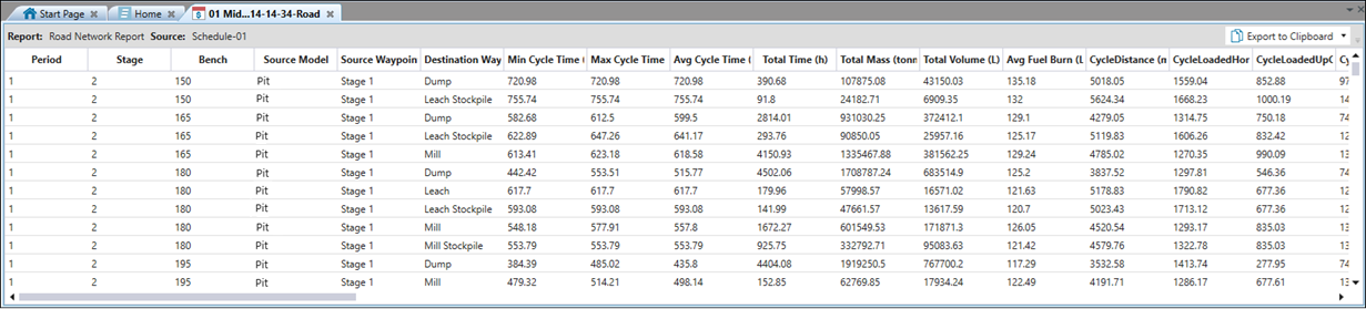 A road network report summarises the time and distances travelled on each bench in a mined pit.