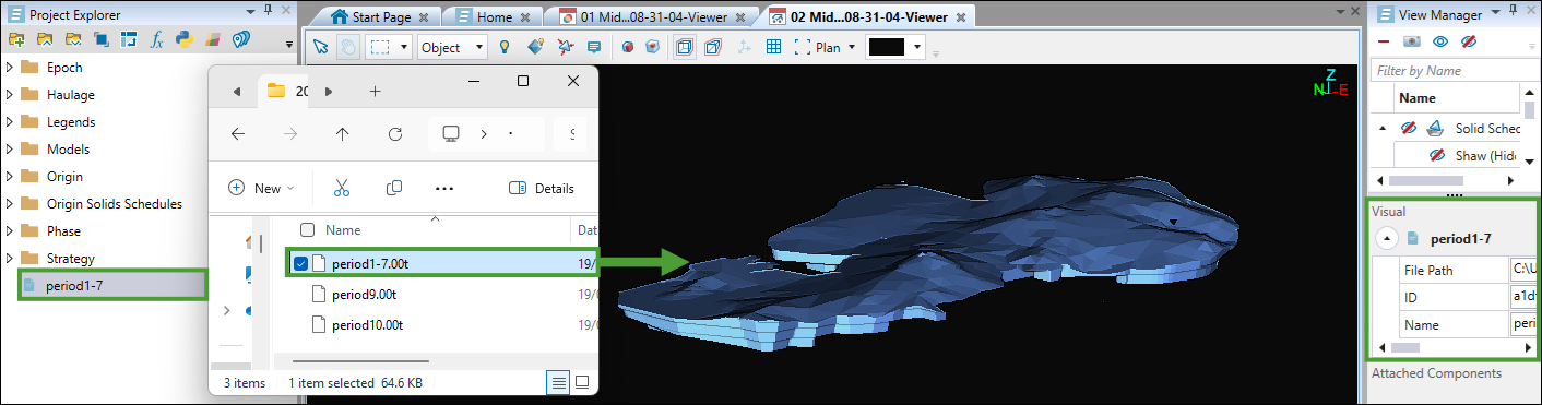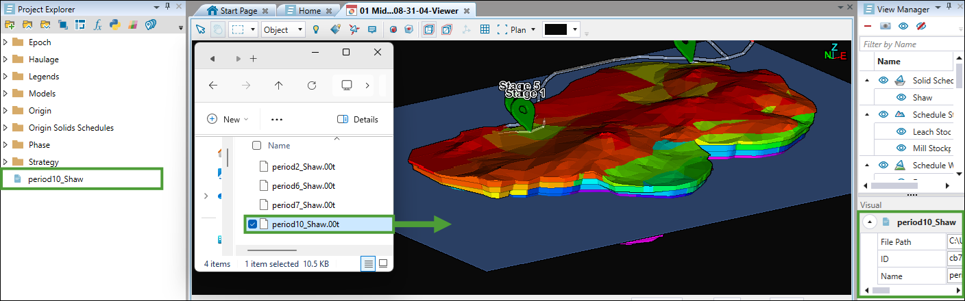 When the export is complete, you can drag the exported solids into the viewer to examine the state of your model in each period.Note: The solids that you apply to the viewer will be added to the project explorer and also to the View Manager.