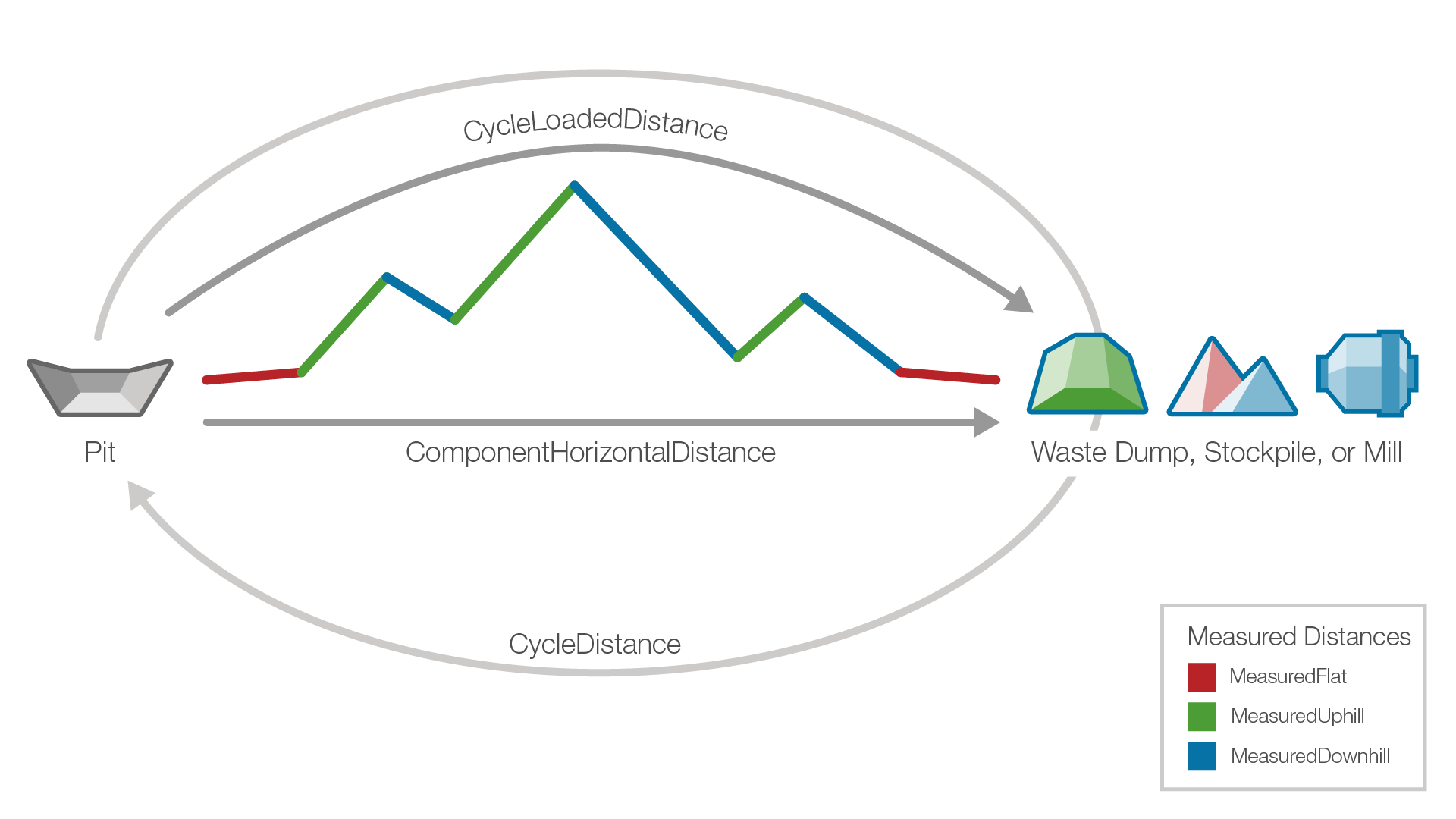 The total distance travelled over a single round trip is referred to as the CycleDistance. The trip is divided into a series of road segments. The total distance travelled to move a solid from a source waypoint to a destination waypoint is called the CycleLoadedDistance.