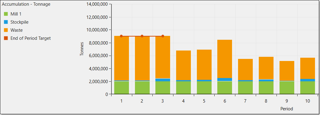 This chart displays the total tonnes accumulated at each destination per period. As seen by the red line, the End of Period Target was set to Accumulation in Calendar > Targets for the first three periods of the schedule.