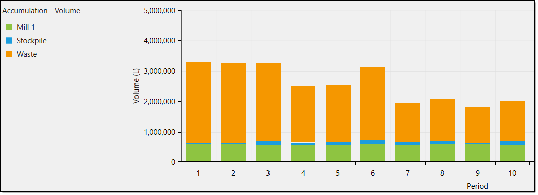 This chart displays the total volume of mined material accumulated at each destination per period.