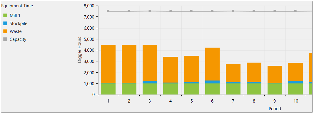This chart displays the total number of hours equipment was used at each destination per period. The grey line represents the equipment time capacity in hours.