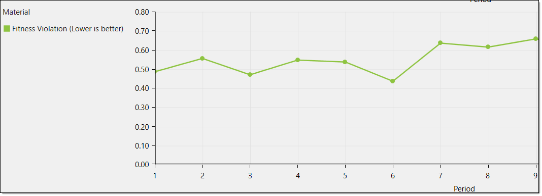 This chart displays the Fitness Violation of the material movement objective per period. For an equipment setup, an equipment chart displaying the fitness violation would be shown.