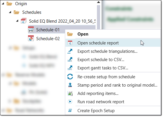 To open the schedule report, right-click on the schedule and select Open schedule report from the context menu.