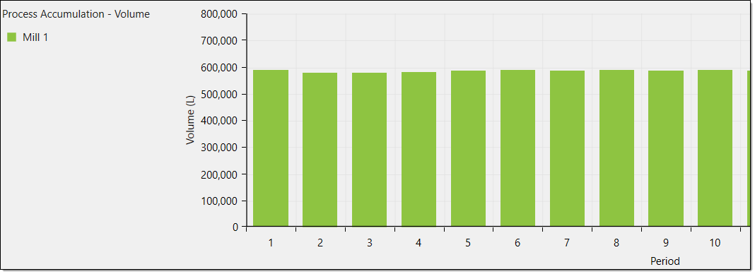 This chart displays the volume of mined material accumulated at a process or mill per period.