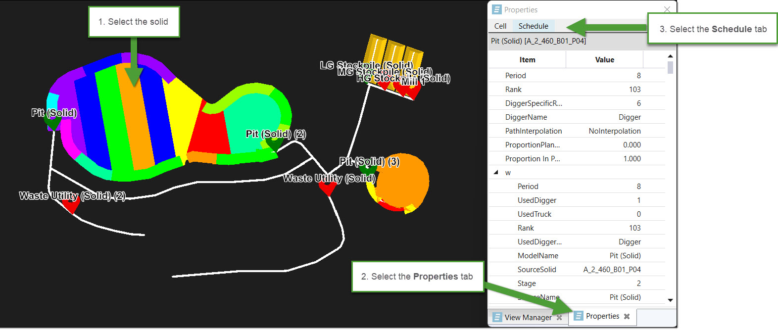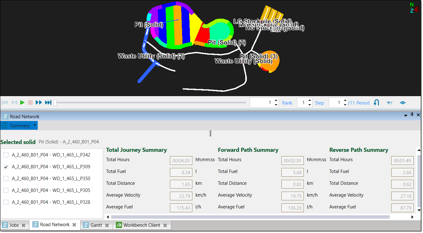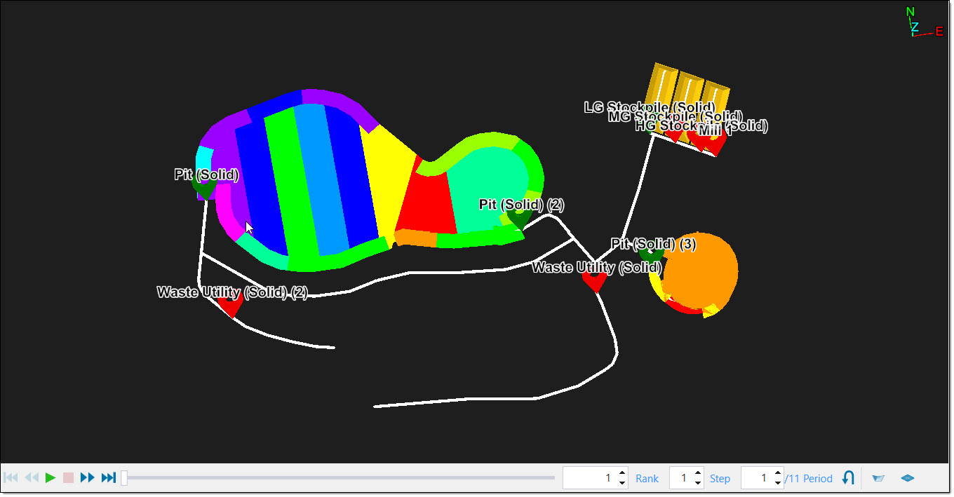 In the schedule viewer, the solids are coloured by mining period. The mine waypoints and road networks are also shown in this view.