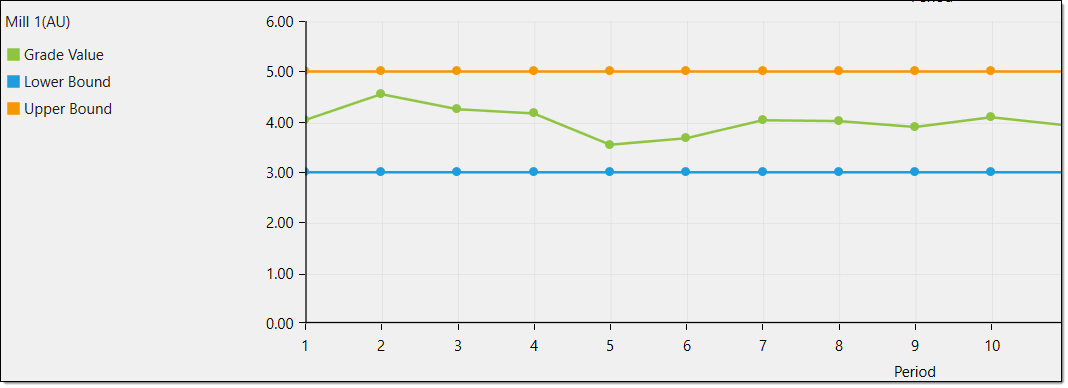 This tab contains the blend charts of the schedule. Blend charts illustrate the Grade Value, Lower Bound and Upper Bound of a process item.