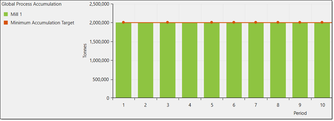 This chart displays the mined tonnes accumulated at a process or mill per period. As seen by the red line, the End of Period Target was set to Process Accumulation in Calendar > Targets from period four onwards.