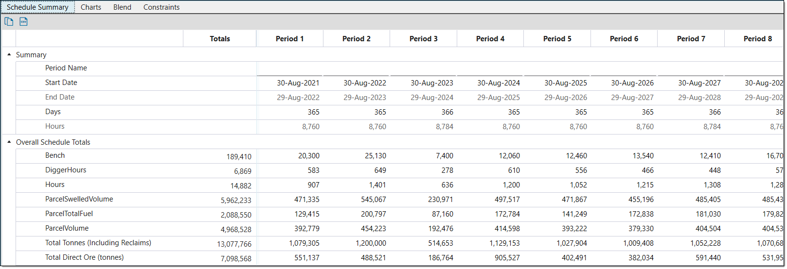 Overall Schedule Totals: Reports the primary mining and processing data per period.