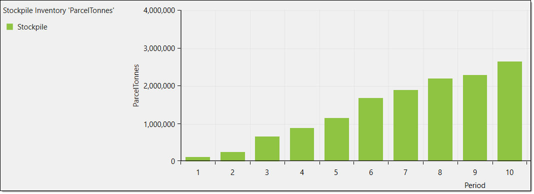 This chart displays the parcel tonnes present at a stockpile per period. This chart is also displayed for other categories listed in