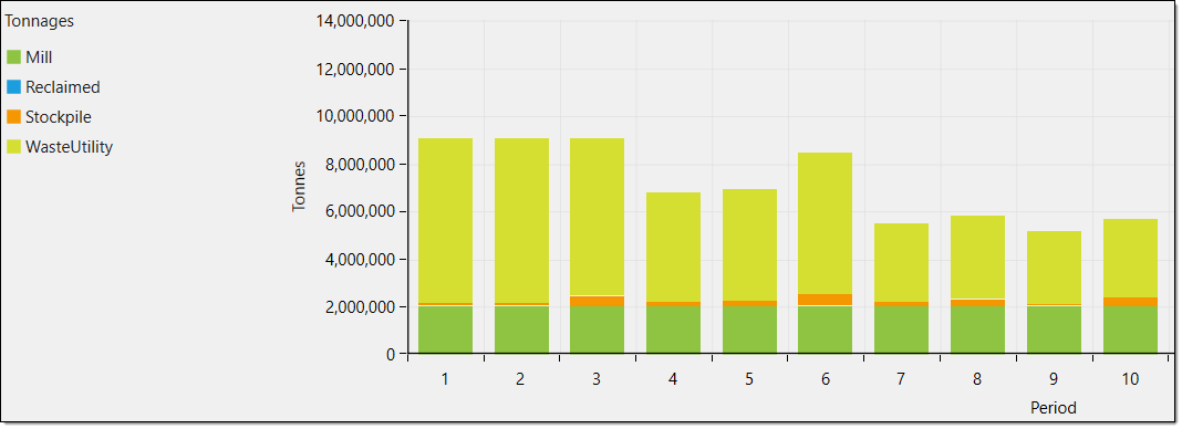 This chart displays the total tonnages per period, including those reclaimed from stockpiles.
