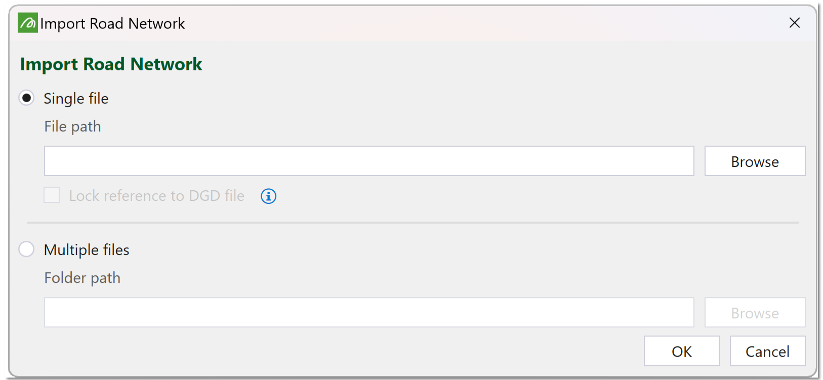 Select the file path to import by clicking the Browse button to open the file path selector. Alternatively, if you want to create a single road network from multiple files, select Multiple files and then click the Browse button to select the folder containing the files.