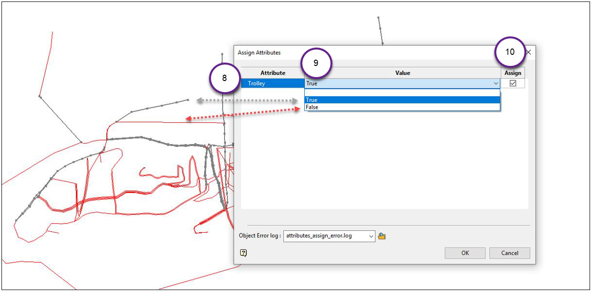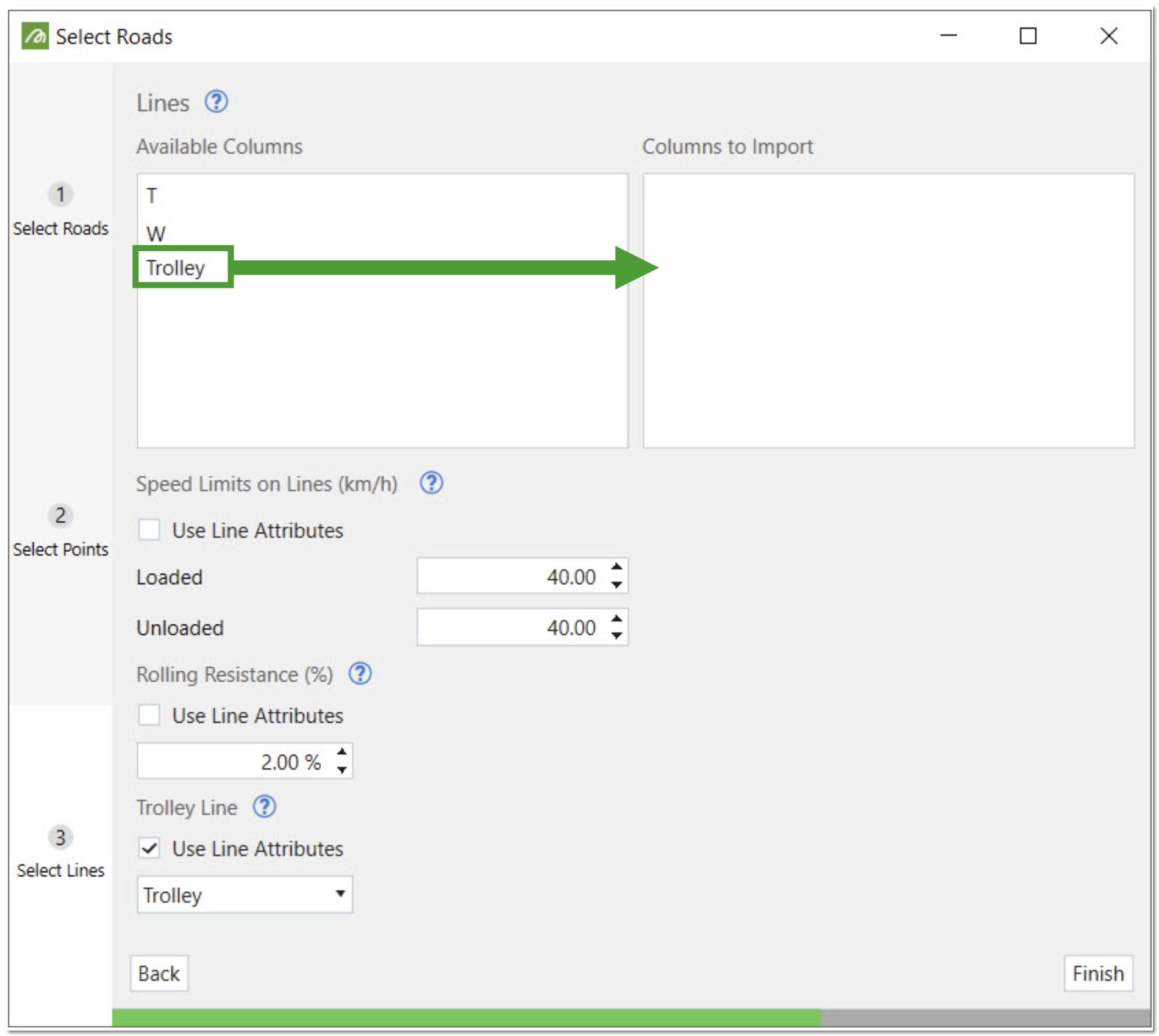 Drag the Trolley attribute from the Available Columns list to the Columns to Import list. Select the Use Line Attributes checkbox of the Trolley Line field and choose the attribute (Trolley).