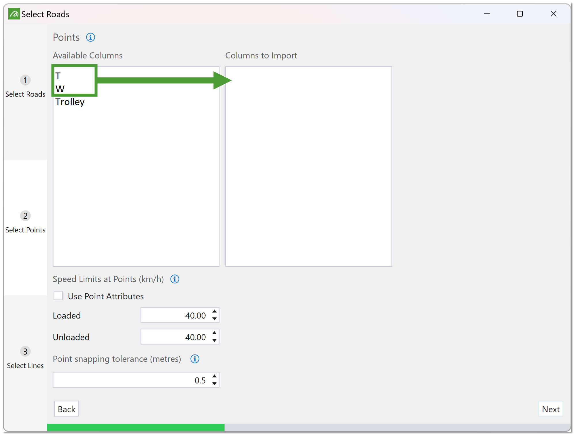 Configure the fields under Speed Limits at Points (for Loaded and Unloaded) and Point Snapping Tolerance as desired and click Next.