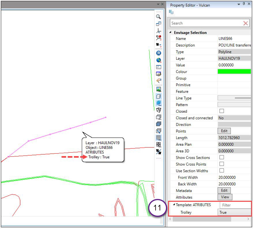 To import trolley and other haul network attributes, you can assign attributes in Vulcan and then import the haulage network into Evolution.