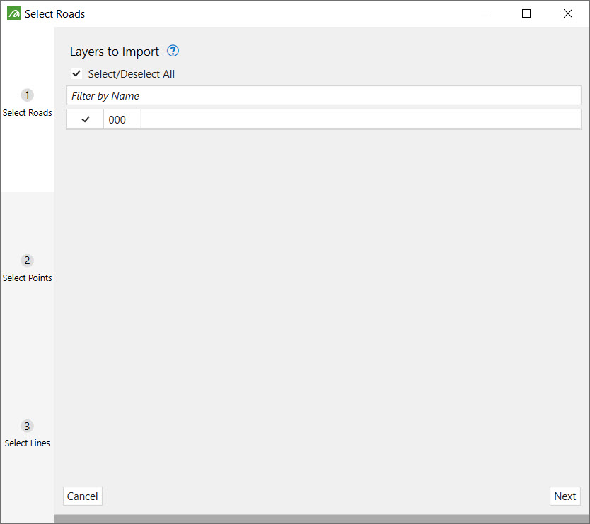 .csv) and Vulcan design database (.dgd.isis) files in the selected folder will be imported. - Select the layer to import and click Next at the bottom right of the window.