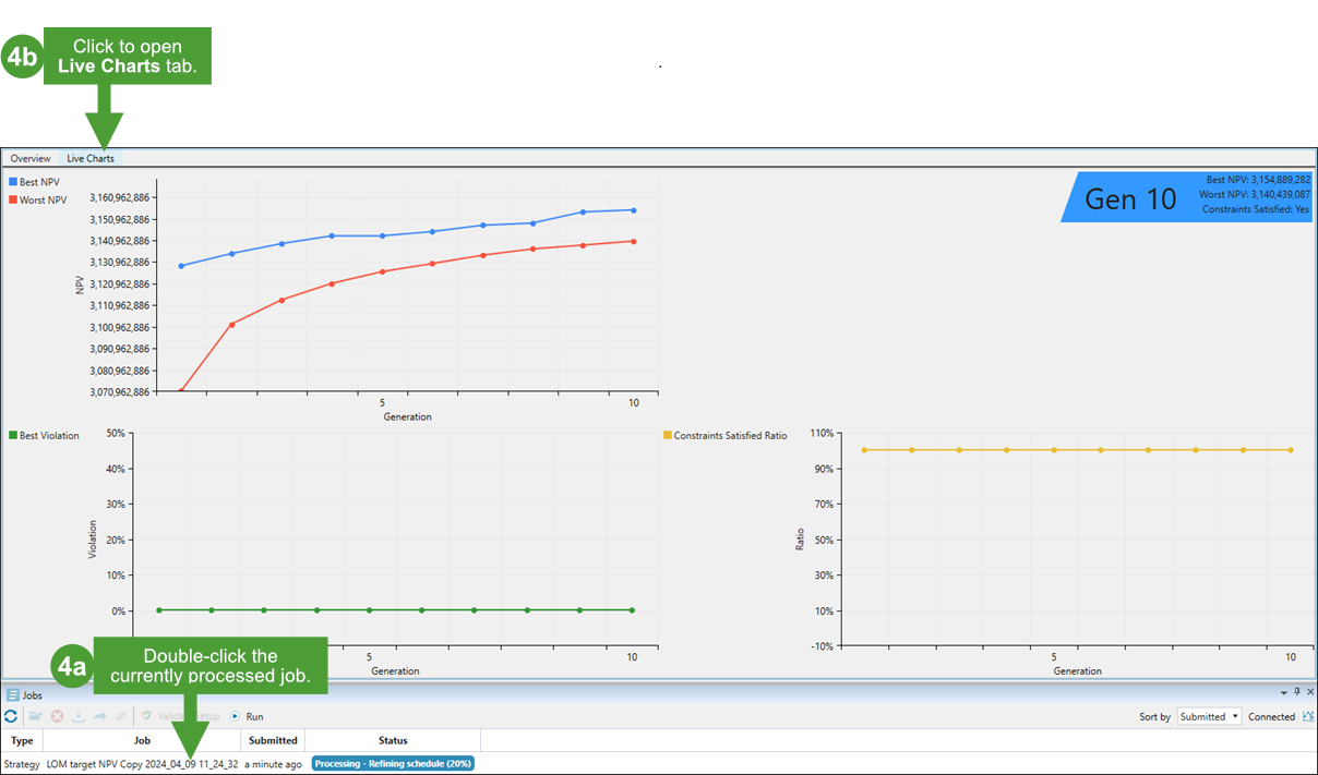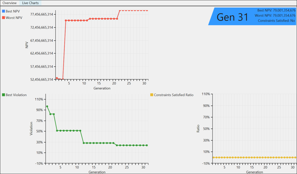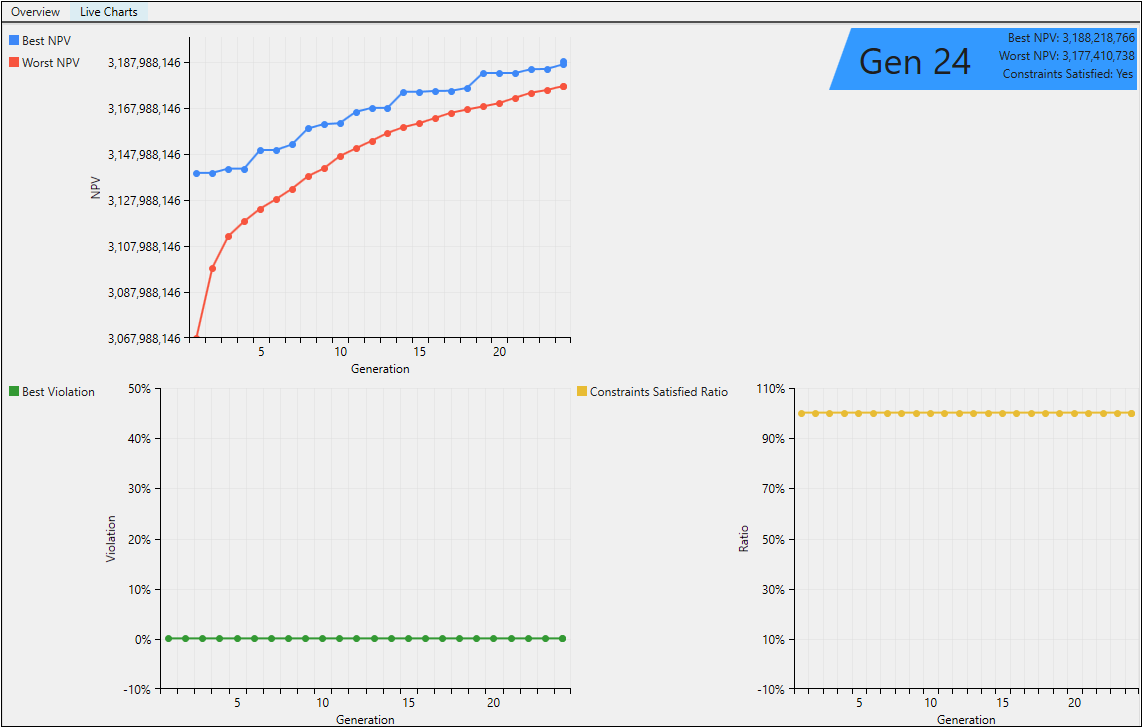 Next, click Live Charts at the top of the view window. You will be able to observe how the charts are being updated in real time as your schedule is generated.
