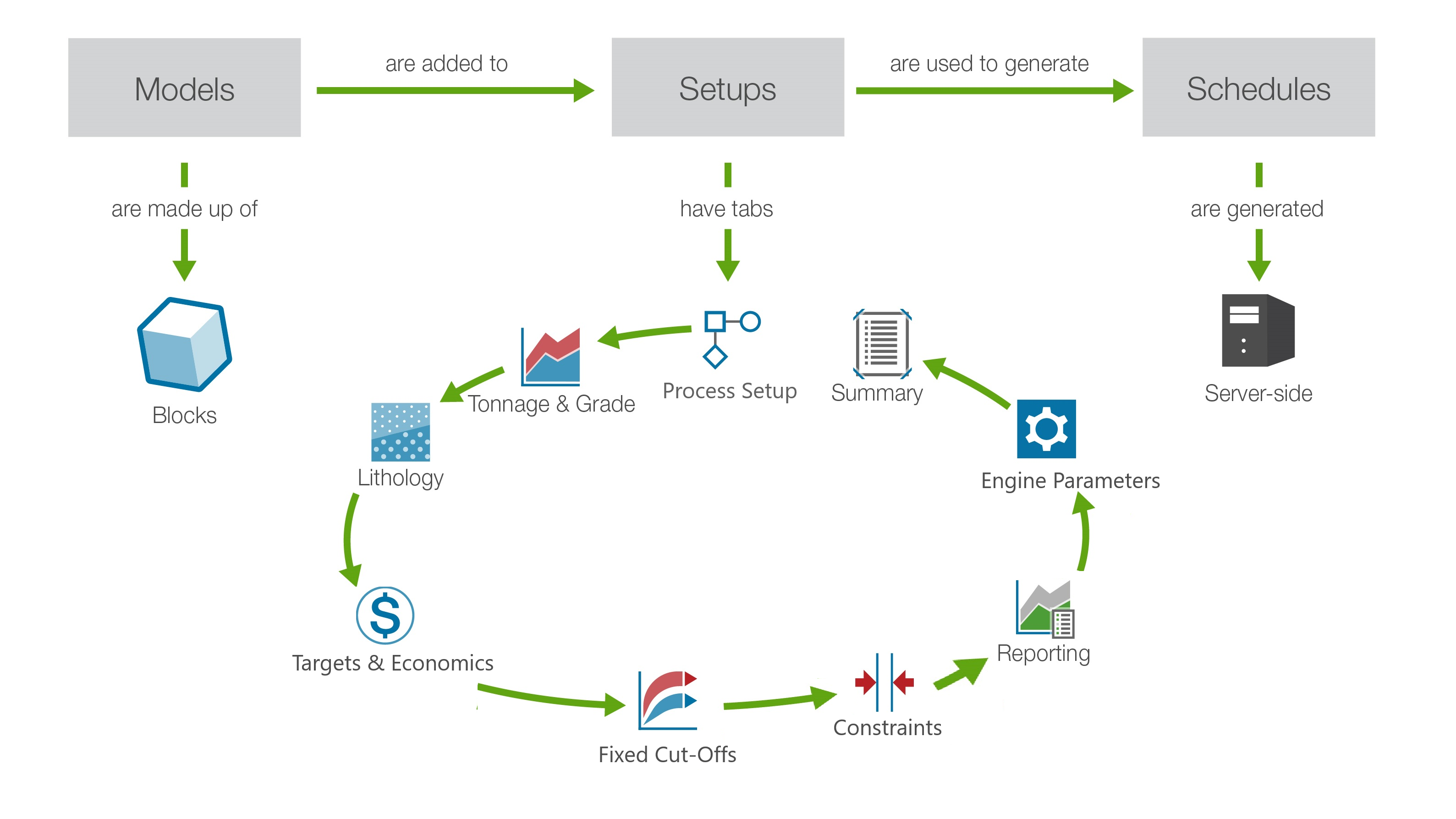 Setups are used to model the mining operation, or a particular scheduling scenario. A setup specifies the following elements: