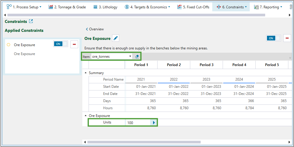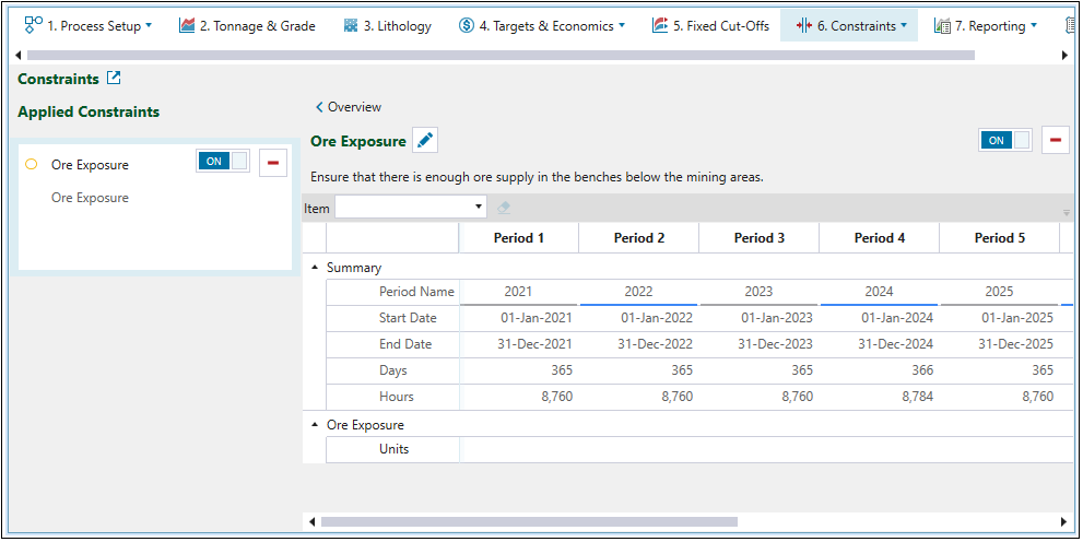 The Ore Exposure constraint specifies the amount of ore material that can be mined in a period to ensure that there is enough ore supply in the benches below the mining areas.