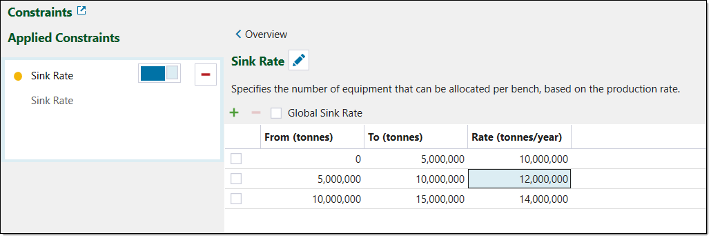 The Sink Rate is the mining duration per bench. It is determined based on the total tonnes available for mining on a bench and the corresponding dig rate. This information is provided using the Sink Rate constraint user interface.