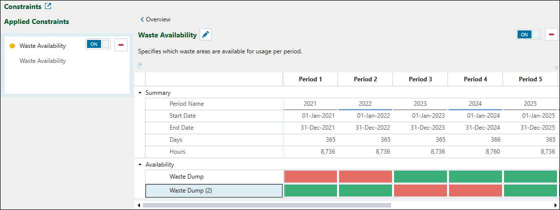 Use the Waste Availability constraint to specify in which periods a waste dump can be used.