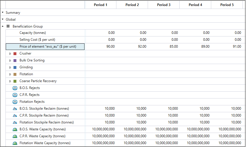The general parameters that you can set for the whole beneficiation group are as follows: