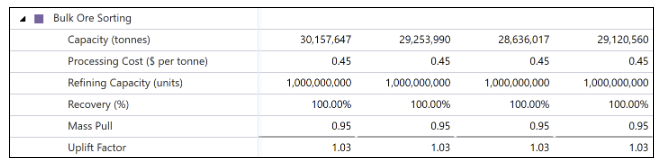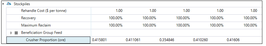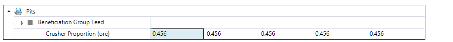 For each lithology, specify the proportion of group feed that is sent to the crusher process. The remaining amount will be sent for bulk ore sorting. You can specify this value as either a number, or a block model variable.