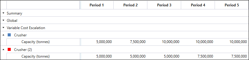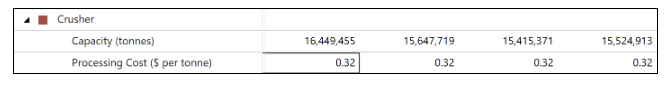 The Capacity (tonnes) parameter specifies the maximum feed tonnes the crusher can accept in a given period. A returned schedule may use less than this capacity, but never more. Enter the crusher limit of the primary crusher.