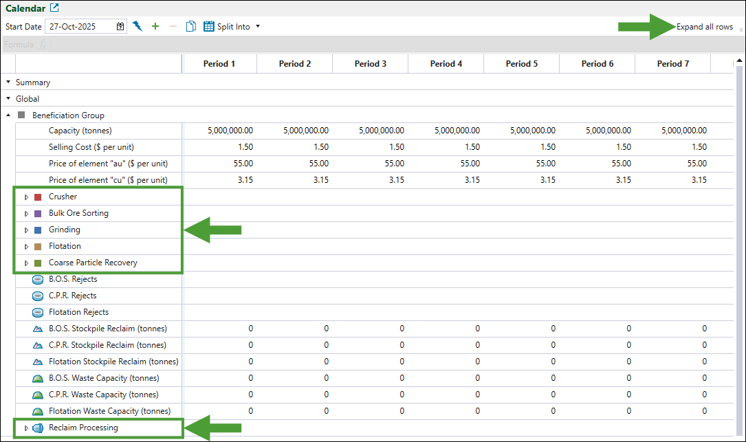 Tip: Use the Expand all rows/Collapse all rows toggle button at the top-right of the calendar table to expand or collapse all the rows for the subprocesses in the beneficiation group.