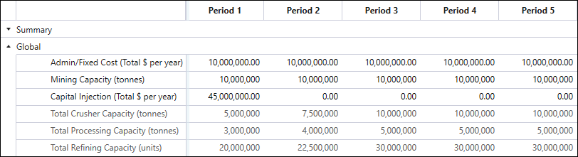 Mining Capacity (tonnes per year): The maximum tonnage (waste and ore) that can be mined in all pits. To specify this mining target, use the Global Accumulation constraint. Although the upper limit that you set is a hard constraint (the limit must be obeyed by Evolution when it generates a schedule), Strategy can return schedules below this limit if they produce higher NPVs. See Global Accumulation for more information.