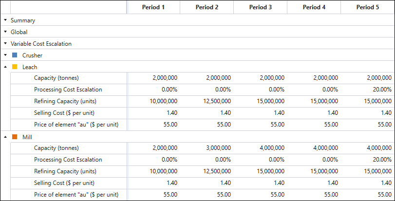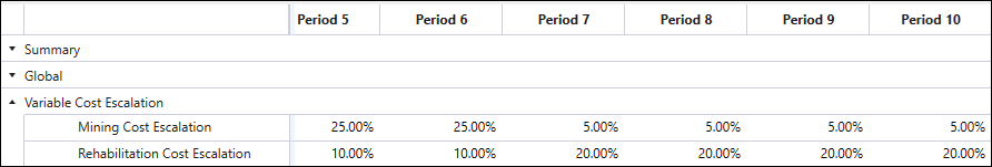 Typically, mining and rehabilitation costs tend to vary based on the mining location in the pit, thus they are known as variable costs. However, these costs may increase over time due to inflation or other external factors. To model cost inflation, enter a percentage increase in variable costs for each period under the Variable Cost Escalation category in the calendar.