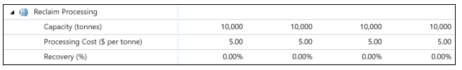 The stockpiles associated with the Bulk Ore Sorting, Coarse Particle Recovery, and Flotation subprocesses must have their reclaim amount set by period. By the end of the schedule, all stockpiles must be reclaimed, hence the final period in the calendar must have a non-zero reclaim amount that is high enough for the schedule to finish within the maximum number of periods specified for that schedule. There are usually 100 periods in the schedule, but you can increase this number in the