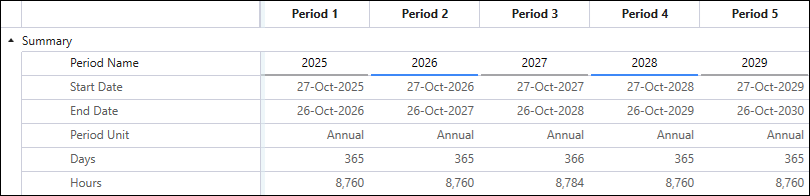 The Summary group provides information on the start and end dates of a period, as well as the length of each period. These intervals are calculated automatically when you create periods during calendar setup.