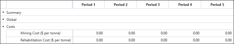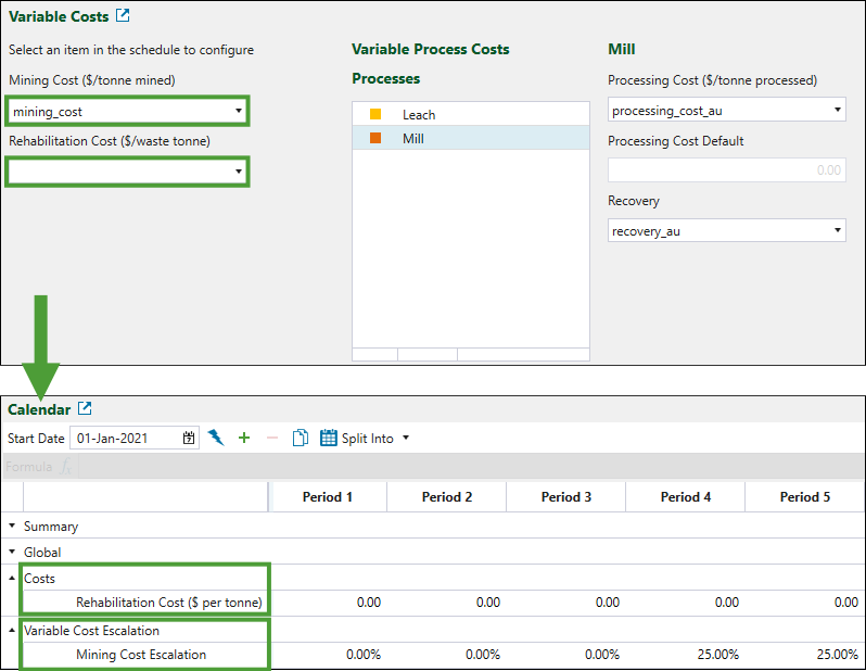 Calendar subtab will include the Costs group (instead of the Variable Cost Escalation group) for you to set the unit mining and rehabilitation costs incurred per tonne in each period.