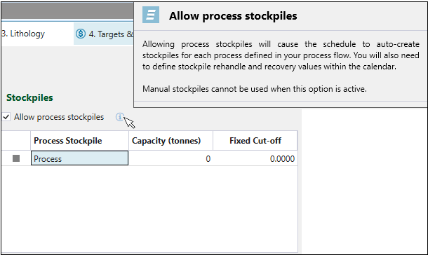 If you want to create overflow stockpiles adjacent to each process, select the Allow process stockpiles checkbox. Next, define the capacity and fixed cut-off for each Process Stockpile. To get the additional information on the whole operation, hover over the