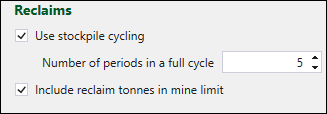 When you select the Use stockpile cycling checkbox, the Include reclaim tonnes in mine limit option will be selected automatically (as the stockpile reclaims happen at the start of the period), and you need to specify the time frame in the Number of periods in a full cycle field.