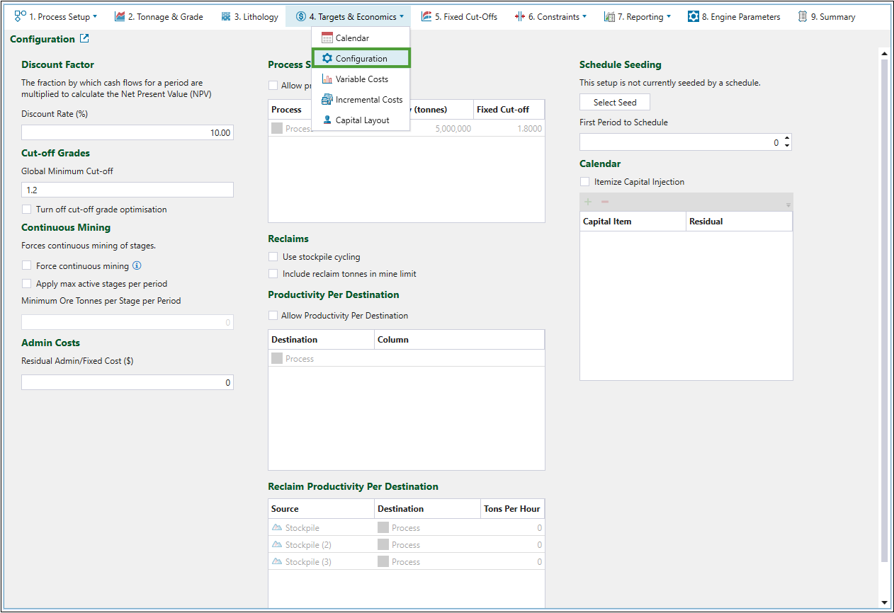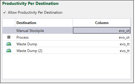 Productivity hours can be modeled as part of strategic optimisation. To do so, select the Allow Productivity Per Destination checkbox and assign a productivity variable (provided by the block model included in your setup) to each destination.