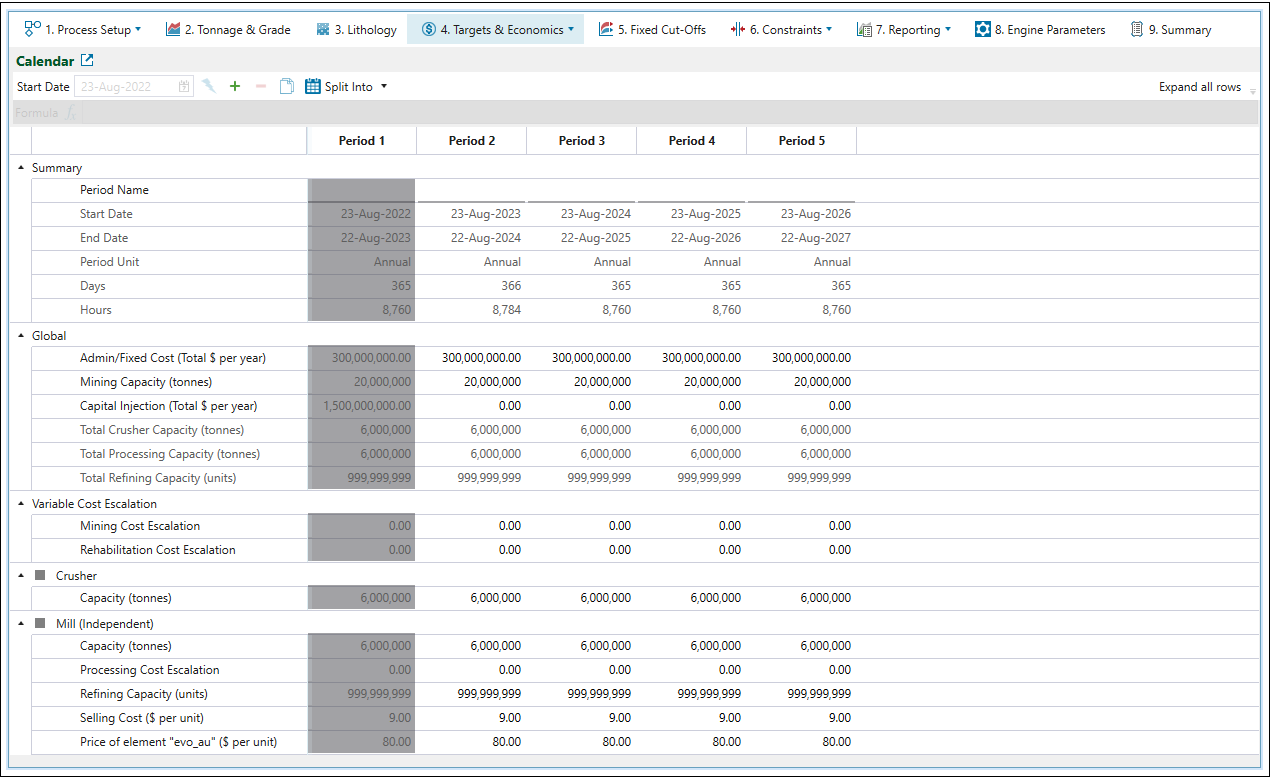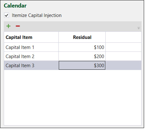 The Itemize Capital Injection checkbox allows you to break down the information on the residual costs that occur in periods that follow the depletion of the pit. Once the pit has been completely mined, site operation can change to "reclaim only" mode, which means that there can be a few periods when only the stockpile is reclaimed. These residual costs are applied to every period where the pit has been depleted and the site operation is in "reclaim only" mode. The items listed under Itemize Capital Injection will be added to the Calendar subtab, where you need to manually specify the operating residual costs for the applicable periods.
