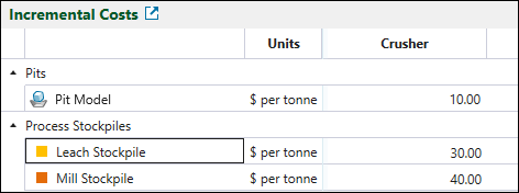 Incremental Costs subtab to define the cost to move ore material from a pit or a stockpile to a crusher.