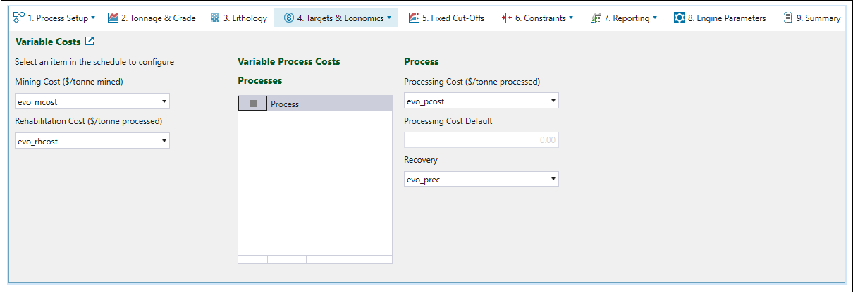 Variable Costs subtab is used to variable costs per setup and process. It is optional to define mining costs and rehabilitation costs for a setup. You need to set the Processing Cost and Recovery for each process in the setup using attributes contained in the pit model.