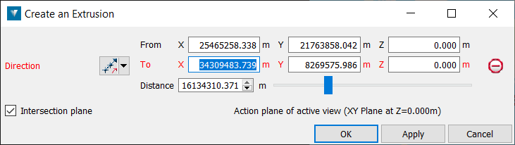 If the extrusion must be terminated by an intersecting plane, rather than by a defined distance, select Intersect with a plane and specify the Intersection plane.