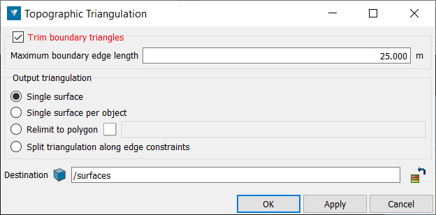 Check Trim boundary triangles to eliminate long, incorrectly generated boundary triangles. When ticked on, specifying a maximum boundary edge length prevents triangles greater than this being created. Note: This option is only applicable to boundary triangles; large voids in the centre of the data will still be modelled assuming they're enclosed by smaller triangles.