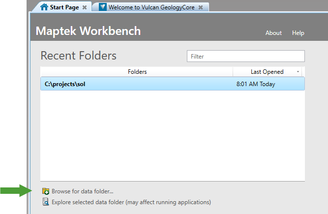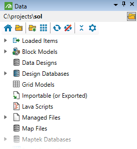 Maptek Workbench allows you to set a folder containing your project data as the data folder. When Vulcan GeologyCore looks for files on the file system, it will look in this folder.