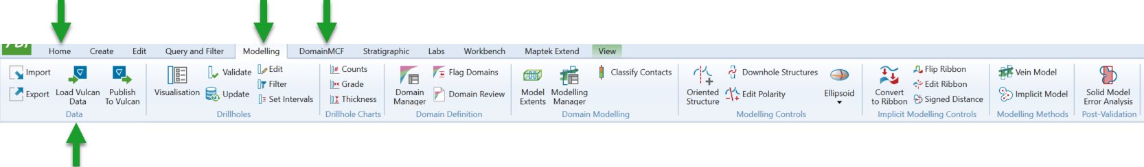 Load Vulcan Data tool, located in the Data group on the Home, Modelling, DomainMCF and Stratigraphic ribbon tabs. The tool automatically detects relevant data in your Vulcan project folder.