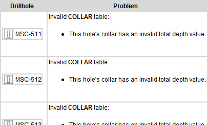 When import is complete, Vulcan GeologyCore automatically performs some consistency checks on the drillhole database, which you can inspect in the report window.