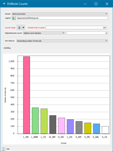 Drillhole counts charts display the total number of intervals for each domain.