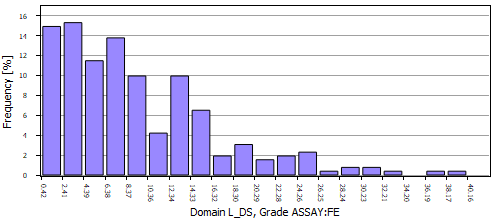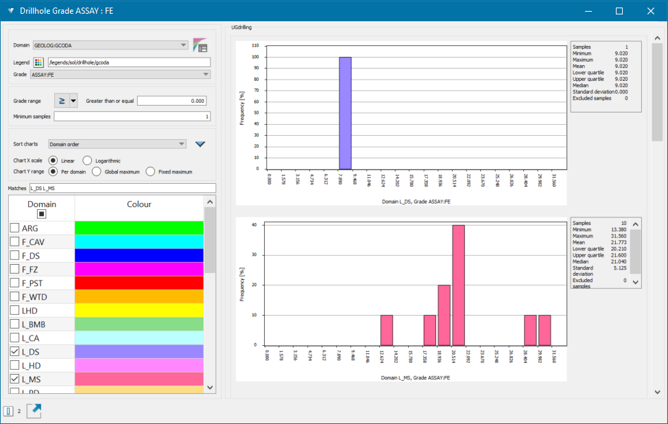 Drillhole grade charts display the sample distributions for a given grade within selected domains.