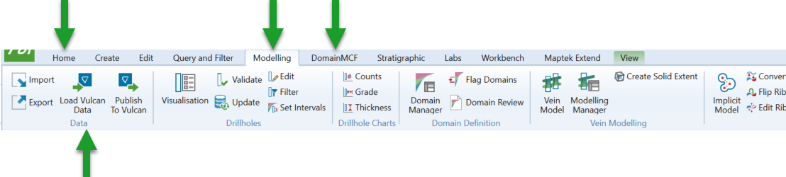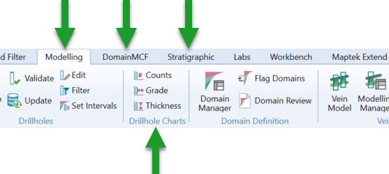 The drillhole visualisation, validation and charting tools are located on the Modelling, DomainMCF and Stratigraphic ribbon tabs in the Drillholes group.
