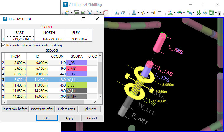 Changing the drillhole visualisation to display the fields in the database table you’re interested in will help you to make sense of the data, and give you visual clues about consistency problems. -