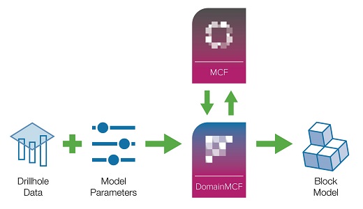 DomainMCF models are generated by bundling your input data and model parameters into processing units called Jobs. When you start a job, the data is uploaded to the Maptek Compute Framework (MCF) for processing in the cloud. The MCF uses machine learning techniques to predict domain boundaries based on the input data and generates a block model. When processing is complete, you can download and view the model in Vulcan GeologyCore.